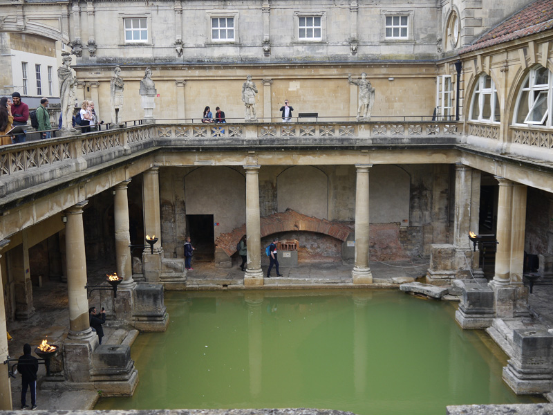 The major part of the Roman baths is the Sacred Spring where hot water at a temperature of 46 degrees centigrade rises at the rate of 1.17 million litres a day. This is now housed in the 18th-century buildings, designed by architects John Wood, the Elder and John Wood, the Younger, father and son funnily enough. The main area is the Great Bath and you can see this in the picture. At night, which was when we were there, they light torches all around the bath area.