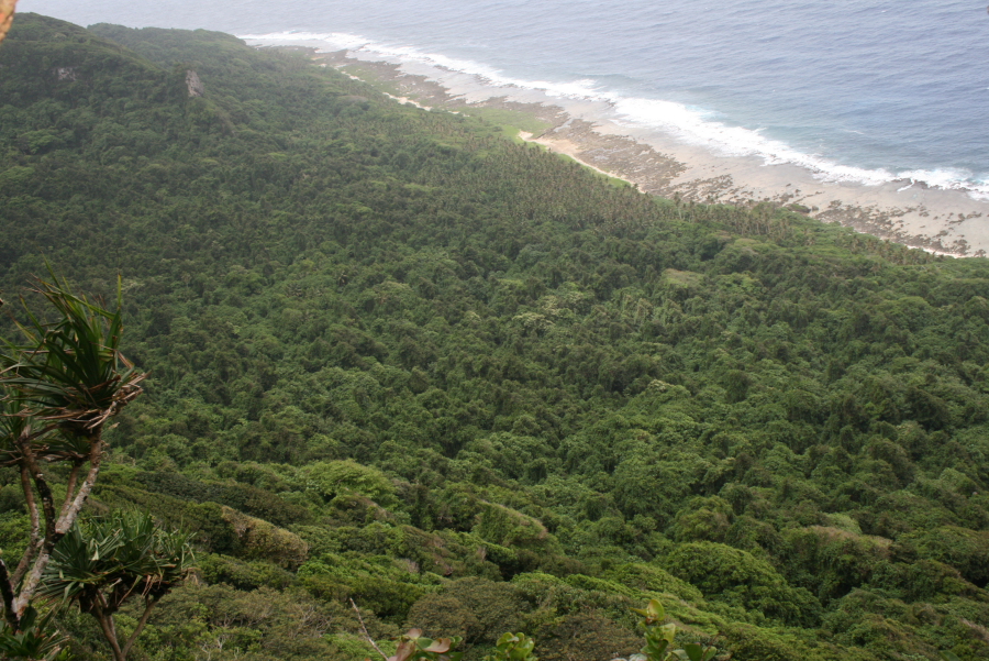 I remember that one time we went through some bush which took us out to a ledge overlooking the beach. Our guide showed us a cave and said that they had found some skeleton bones there a year ago. ‘We just left them’, he said, and, once again, I realised the difference between my world and theirs. There was no investigation to date the bones, no alerting the police to see if there were any missing persons, nothing. The bones were there and that was where they would stay. We finished our journey with half an hour on the beach and this was my typical, or archetypical, desert island. The trees running down to the shore, the white sand and the little lagoon with waves breaking over the reef a hundred yards or so off shore. The trouble was that the reef surface was under the waters of the lagoon and any attempt to walk into the water could result in sliced feet. Looking at the photo now, I am assuming that the white sticks are just that and not bones because if they had been then our friendly guide would have just left them.