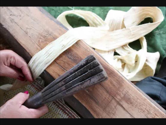 After this, and this was the noise we could hear so clearly, the bark is beaten on a wooden block using a ribbed implement and I’m not going there. It is, however, for those of you who wish to know, only ribbed on one side. It is this side that is used to beat the tree bark first and, at a later stage, when the bark is much thinner, the smooth side is used. When the strips are thin enough, and before you ask I have no idea, they are beaten together into a large piece of material. Normally the strips will stick together but if needed they use a form of glue from natural sources.