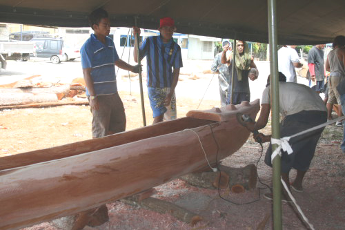 Carrying on this hand-made, or even home-made craft theme, on our return to Tongatapu we found the annual, traditional, canoe building competition. As far as I could see it was mainly for young people and they had a week to complete their task. They started with something like the picture on the left and ended with something similar to that below. The boats were left overnight in the open area and, as far as I know, no mechanics broke the curfew and tried to fit the coanda oars. Sadly, we couldn’t stay long enough to see the races which took place at the weekend.